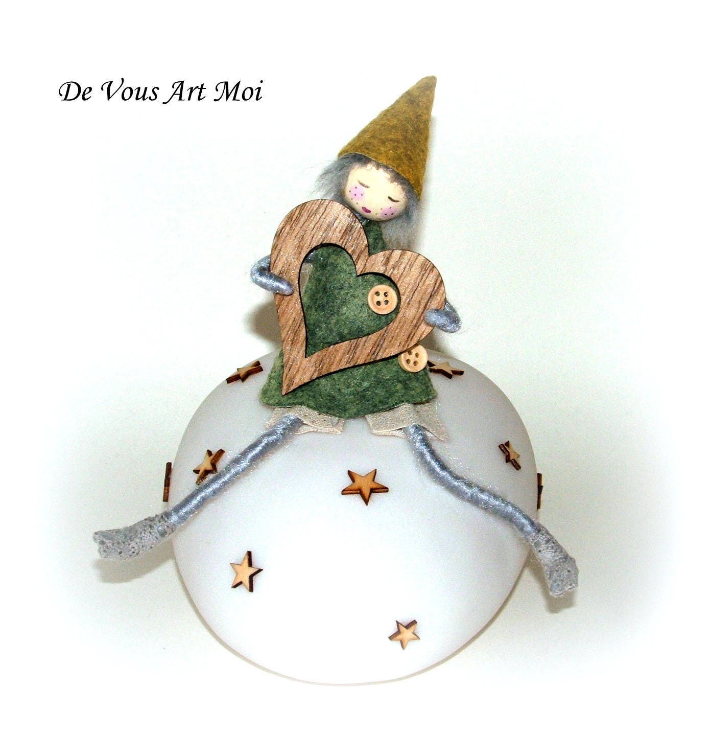 personnage réalisé par mes soins(cheveux en véritable laine de mouton mérinos teintée écologiquement,tête en bois peinte à la main,vêtements en laine,lin...)